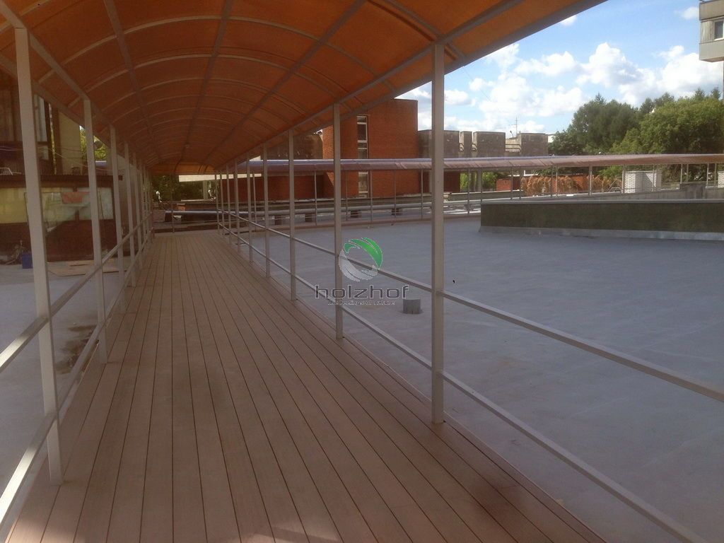 В бизнес-центре на "Войковской" (что на Ленинградском шоссе в Москве) выполнен монтаж переходов между корпусами офисных зданий на кровле. Дорожки выполнены из Универсальной доски из ДПК общей площадью 660 кв.м. Теперь для удобства сотрудников комплекса перейти из одного строения в другие два, занимает не более 1 минуты, а раньше приходилось "путешествовать" по этажам и многочисленным лестничным переходам через первые этажи зданий.