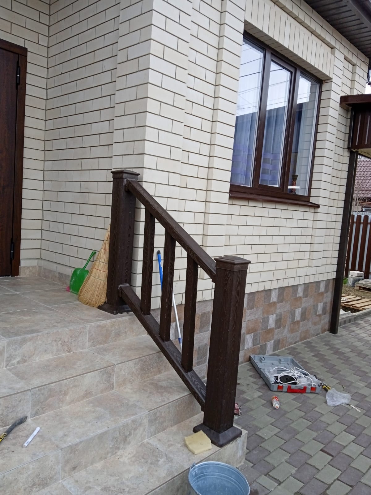 Перила пришлось пилить под углом и крепить без хомутов-креплений, так как клиент отказался покупать дорогие алюминиевые хомуты с шарнирами